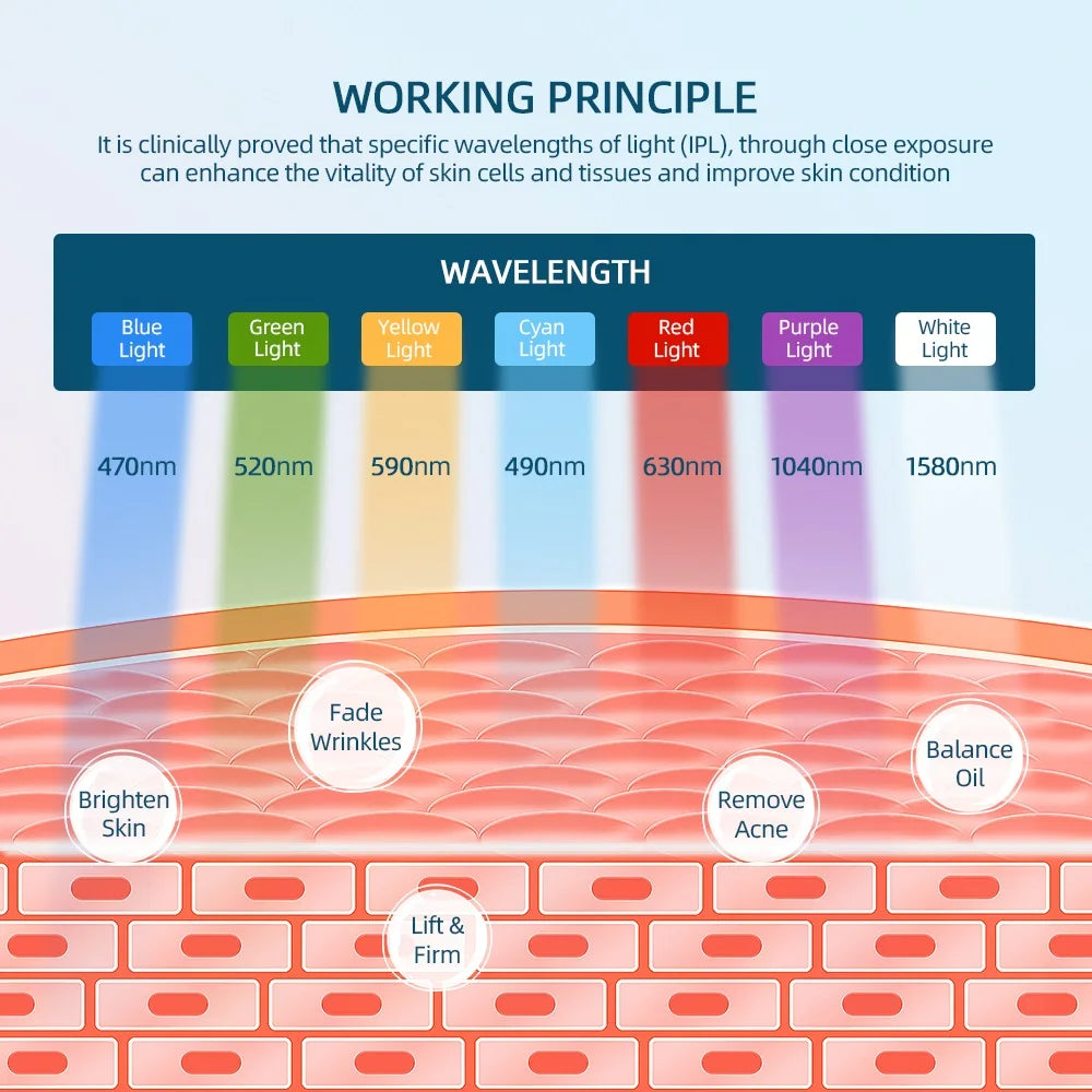 Yellow light(590nm):Improve cell oxygen exchange, replenish energy to skin cells.
